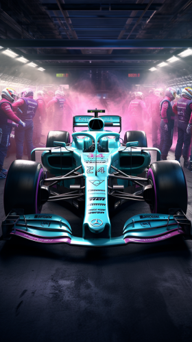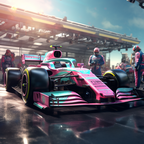 Formula one racing team, Formula one racing car surrounded by pit crew, racing game render, unreal engine, highly detailed, hues of blue, mint green and pink --ar 1:1