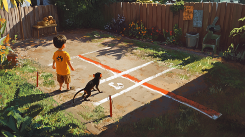 A chalk-drawn race track stretches across the backyard, with a finish line marked by a strip of red ribbon tied between two small stakes. Charlie a little boy in yellow t shirt and Coco the small monkey stand at the starting line, ready to race. --ar 16:9