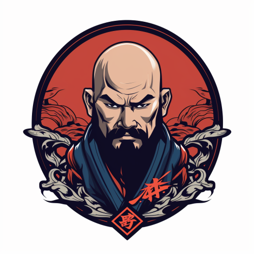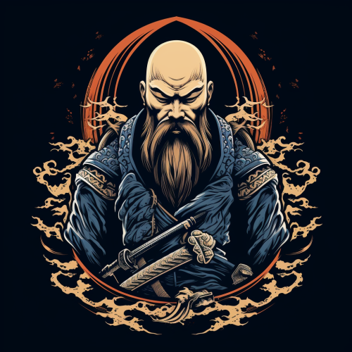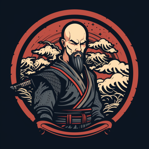 stylize bald shogun warior with short circle beard sword logo japan style
