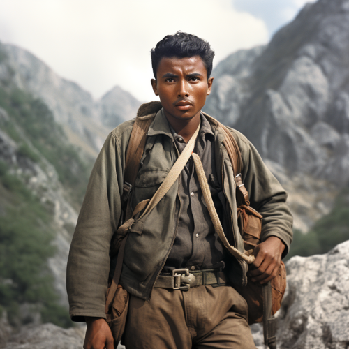 young 1950s resistance fighter, full body shot, film still | Black man, asian features, tall, skinny, muscular, spiky brown hair | 1950s style, high-color hiking jacket, black orange and green, baggy army cargo pants, boots | determined, stern, aggressive, serious | mountainside path --v 5.2