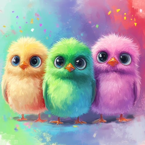oil painting art three adorable, fluffy birds with large eyes, each in a different color: purple, orange, and blue. They are standing side by side, and the background features a vibrant rainbow. The overall feel is playful and cute, with the birds looking expressive and friendly, making it look like an illustration from a colorful, cheerful animation or children's storybook. There are also confetti-like elements, adding to the festive and joyful atmosphere.