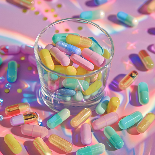 generate a simplistic minimalist collage, inspired by pop art and kusama. the subject is: a hormone injection and pills. vibrant flat three tone colors with a color palette of: pink and blue and black. multilayered, retro, creative and artistic --v 6.1
