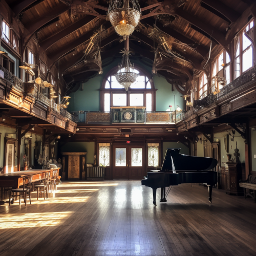 Dance hall in a gorgeous western-style building. A piano is placed in the distance.