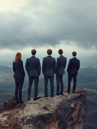 Realistic photo of a group of men and women of 5 people, standing, in three-piece suits, on top of a mountain looking at a beautiful landscape --ar 3:4 --v 6.1