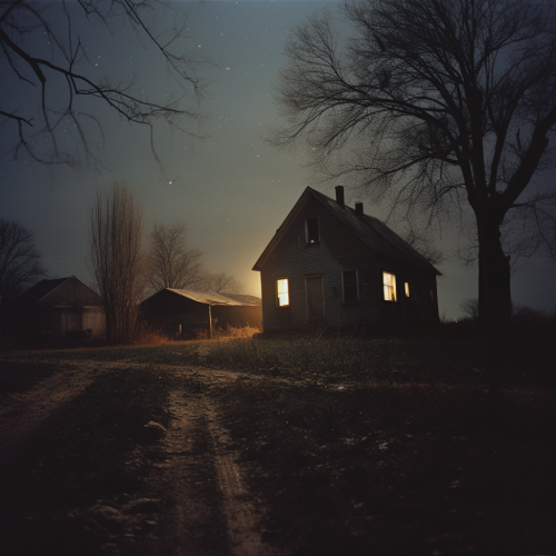 a Polaroid style photograph of a farm house at night in Indiana