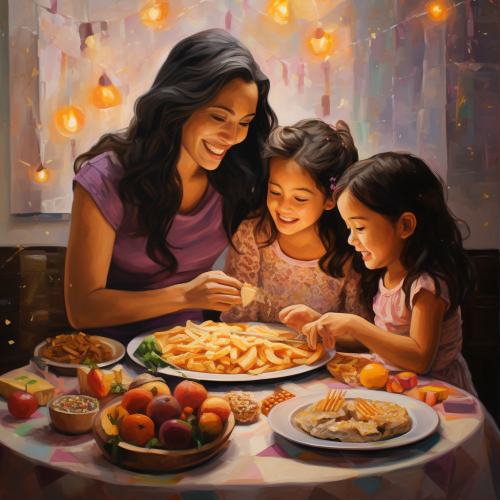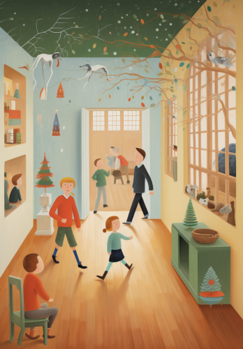 an image of in a room with kids running around the room and a father and mother talking, smiling while looking at the kids, in the style of nicholas hely hutchinson, alma woodsey thomas, sou fujimoto, christmas themed, school of london, pont-aven school, adventurecore --ar 9:13 --v 5.2