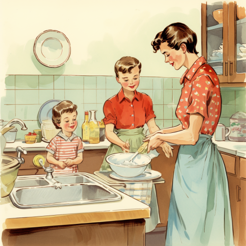 So he comes, he finds a lady who is supposed to be the mother of two children. The two children are trying to bring some biscuits from a cupboard while their mother is busy cleaning the dishes with a certain carelessness also because it causes the water to overflow from the sink. There is a mother who is washing the dishes and but You don't notice that the water flows out of the sink onto the floor. She is drying the plate. And the two children who want to take the biscuits and one of whom is about to fall off the stool in an attempt to take the biscuits and pass it to his sister who signals him to be quiet. Then there is the window which overlooks the garden with the curtains and on the kitchen counter there are two cups and a plate, then. Here is the mother drying the dishes. Then there is the child who takes the biscuits and climbs up to get them from the cupboard. And this should be the sister who also wants that thing, she also wants cookies. Then there is she spilled some water. Then there are two bowls with a plate here. I think they're setting the table. And then this one here is the one eh you see, I don't know what it's called that one the little box to always put on top you always put the the the cups are the ones I don't like here I don't remember what they're called I don't remember what they're called those there that nothing that there I don't remember. Then I don't know what this stuff is. Well that's already said, the cups and the placemats! I just don't see this here at the top, I really don't know, here at the top what it could be. a window perhaps, with curtains, perhaps I interpret it that way. I've done all of these. This one here could be a a fridge. It can be a fridge. And here that this is I already said that it has already fallen to the [...]