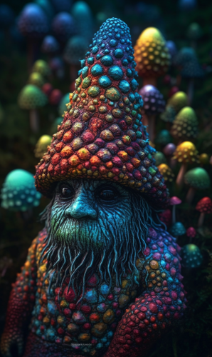 **Aboriginal Dot Painting, Topiary Design, lsd trippy Surrealism Hyper - realistic forest gnome elf hybrid, shroom rainbow hat, Vibrant Interplay of Light and Shadow, unreal engine, horror, lit, render 3d, surreal, beautiful, cinematic, hd, high res, intricate, coastline --ar 9:15 --upbeta --s 750 --v 5.0