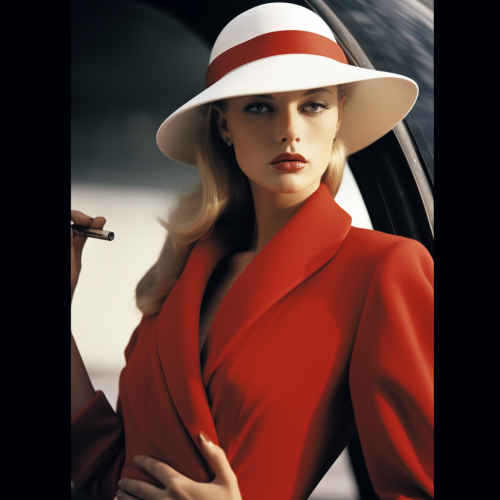 blonde girl wearing tight red dress and round hat, with white scarf and smoking cigar, dress style 1930, helmut newton style, realistic photo