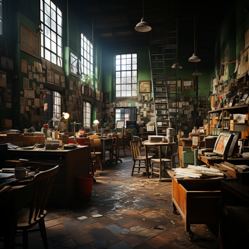 The ancient warehouse area, covered in thick dust, with a lot of ecommerce boxes and peeling walls, creates the feeling of witnessing strange stories from the past. --ar 9:16 --v 6.1