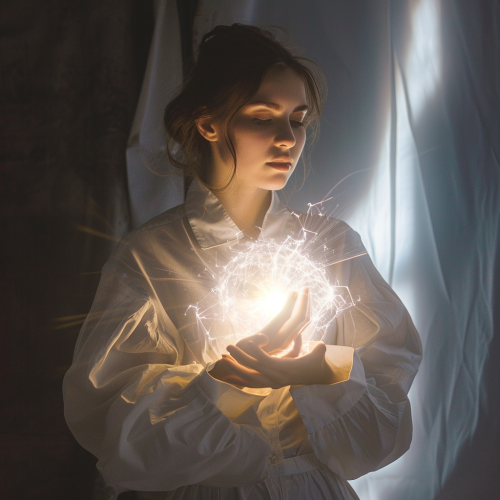girl in light colored clothes holding luminous energy, realism, real photo, light colors --s 50 --v 6.0
