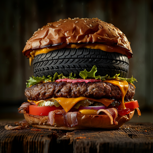 Stunning high-resolution photograph taken with a professional full-length camera of a beautiful hamburger with tires insted of bread, realistic, close up, advertising --v 6.0