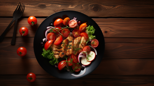 healthy food dish, view from top on a dark wood table, photo realistic, advertising photograph