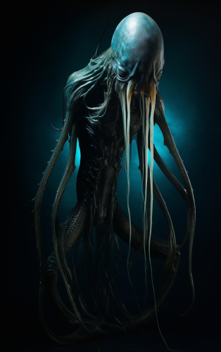 horror creature, abyssal, HR Giger's alien inspiration, as tall as a large human, bioluminescent, alien creature, stylized, full shot, threatening pose --ar 10:16