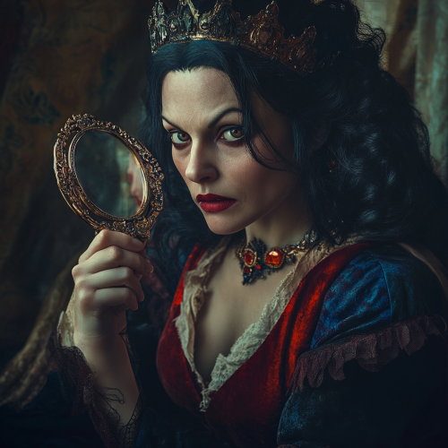 realistic version of grimhilde, the queen witch in Snow White story. Very authentic to the Disney version.Colorful photo, cinematic light. She is holding a hand mirror. She looks mad.