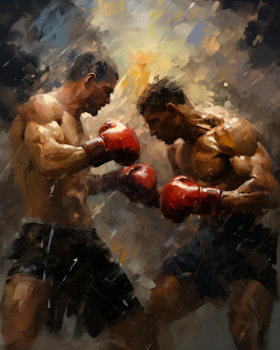 Be specific in your description, focusing on the intensity of the moment, the expressions on the fighters' faces, and the dynamic movement of the strike. Include details such as the traditional Muay Thai attire, the atmosphere of the ring, and the reaction of the audience to enhance the visual impact. The description should be concise yet rich enough to inspire a striking and powerful image.--ar 16:9+ --v 6.1 --style raw
