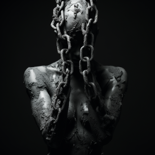 b&w, sculpture, lights in the hand, chain, m4k resolution, monochrome, dark mood, black bakcground