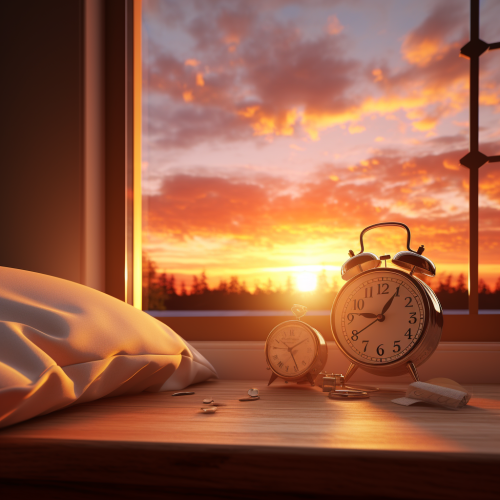 digital alarm clock showing 7am time next to the bed showing sun set through the window, 4k