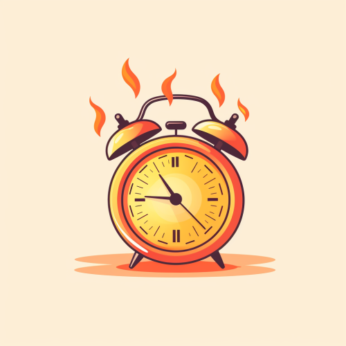 simple cute illustration of an alarm clock on fire, isolated on a solid background