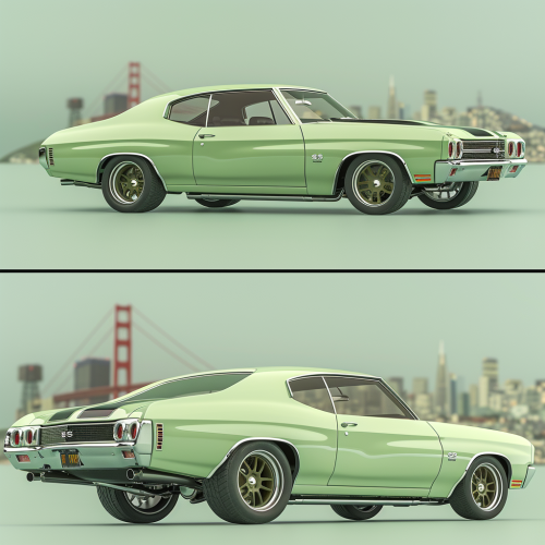 1970 Chevelle LS Pro Touring, driver, streets SF skyline, light green, studio lighting, detailed