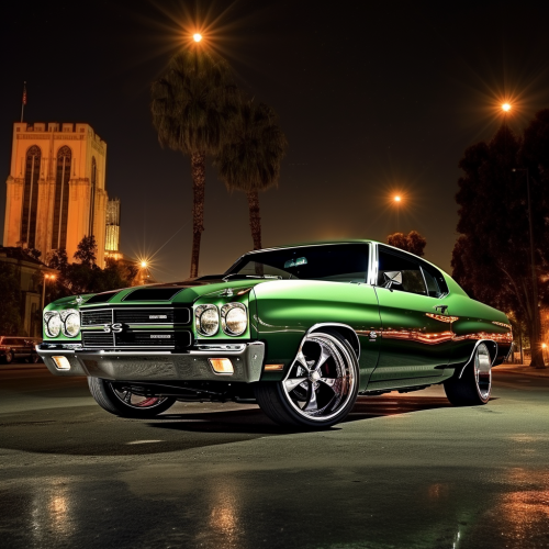 1970 Chevelle LS Pro Touring, driver, SF skyline, light green, studio lighting, detailed, manocore, --v 6.0