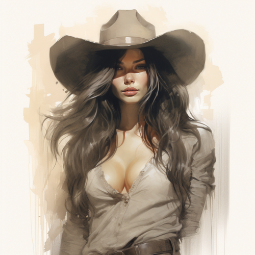 sketch drawing of a beautiful witch, long hair, wearing a cowboy hat, portrait, neutral beige colors