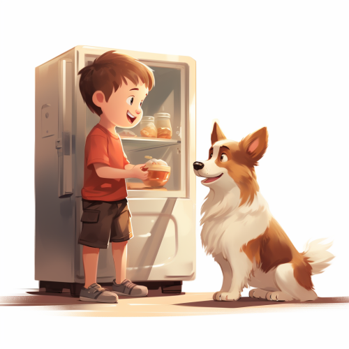 a 6- year old boy, wearing a red t-shirt, brown shorts and white snickers. A dog corgi. Corgi and a boy are searching for something in the open refrigarator. Simple and animated style. White background.
