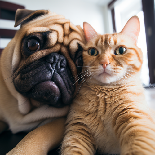 comics realista de un perro real y un gato real, felices, en medio de muchos snacks, con un cartel en sus manos que dice textualmente "Nos encantan los snacks IKAIKA"