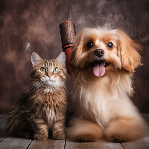 dibujo realista de un perro real y un gato real, felices, en medio de muchos snacks, con un cartel en sus patas que dice textualmente "Nos encantan los snacks IKAIKA"