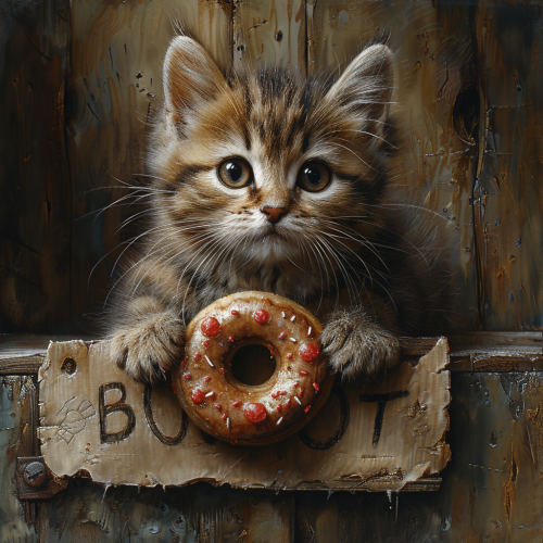 square format, hyperrealistic criminal mug shot picture of a cat holding the mug shot sign and also a donut, (detailed fur texture:1.2), glossy eyes looking directly at camera, soft natural lighting, (playful yet guilty expression:1.3), background booking room, high definition --s 750