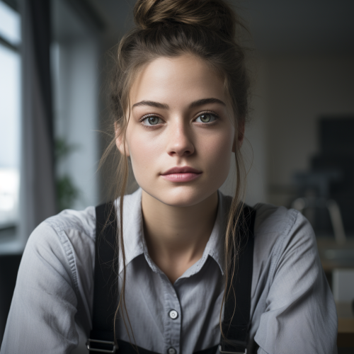 photorealistic three quarter portrait of a dutch young woman mid-twenty realistic face, not pretty, wearing dungarees and long sleeve shirt, sitting in office, looking up to camera,Sony a7R IV camera, Meike 85mm F1.8 lens, V5.2--style raw