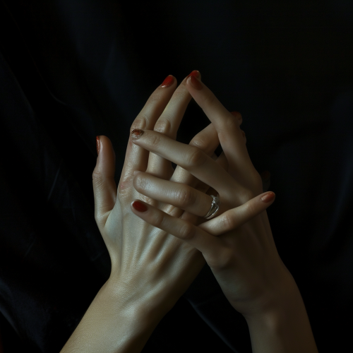 female hands in shushing gesture, realistic, cinematic, medium contrast, HDR, --v 6.0