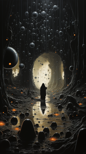 dark black squid figures wrapped in black clothing huddled closely near dark water, futuristic, horryfyingly evil and insidius, boss fight arena, frank frazetta::1 Yayoi Kusama --ar 9:16 --s 350 --no red