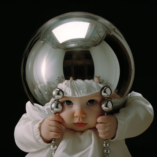 photo, a baby has a mirror sphere covering face, holding onto a dolls head in hand