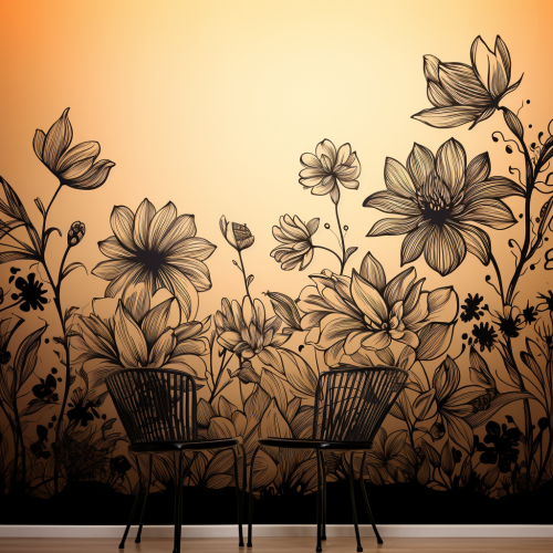 a hand drawn metallic gold on black wallpaper, flat image, no furniture or other elements besides wallpaper, dimension is panoramic, design should be seamless meaning you could attach the right side to the left and it would create a continous design, the design should be tropical flowers and foliage, palm fronds leaves, monsteras, plumerias, bird of paradise plants, taro plants, add some coffee berries to the stems of some of the foliage, nothing but flowers and foliage should be in the design