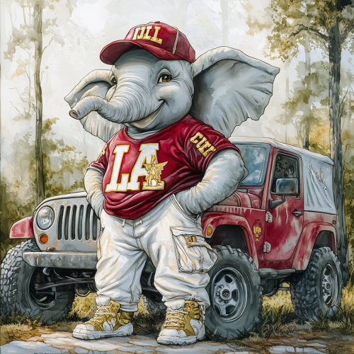 Create a 3D hyper realistic airbrush alcohol ink watercolor illustration of a caricature of an Alabama crimson tide elephant with gold embellishments. He is wearing a Alabama crimson tide jersey and cap, white cargo pants, and red, white Air Force ones, as he leans against a jeep with a tattoo like Alabama logo symbol on the side and the hood. Soft scenery background.