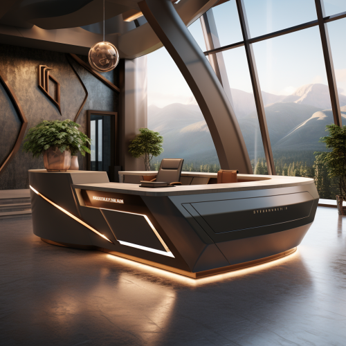 Futuristic concierge desk for an upscale office with lots of natural light made of wood and marble and bronze, ultra detailed, highest detail quality, ultra realistic, photography lighting, overcast reflection mapping, photorealistic, cinemeatic, movie quality rendering, octane rendering, focused, 8k, depth of field, real shadow, vfx post production, rtx ray tracing lighting --s 250