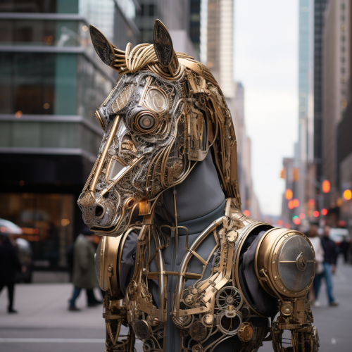 Realistic image of human body with horse head.