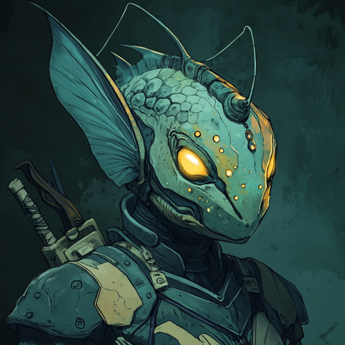 a charismatic and intimidating reptilian draconic vesk humanoid with black scales and head spikes and glowing green eyes wearing a brown leather duster standing in a starship cargo bay. Graphic novel.