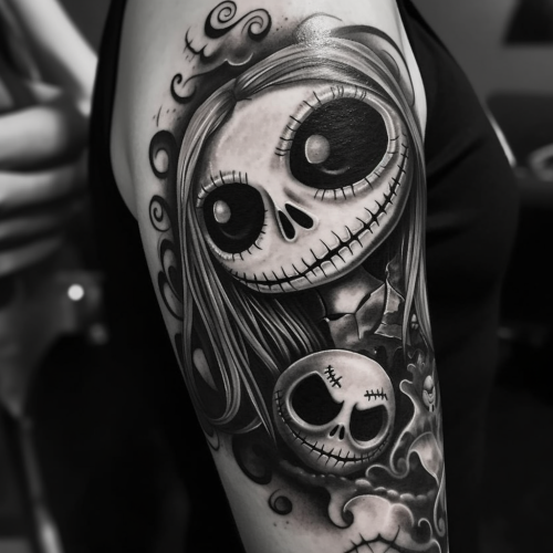 Jack Skellington doing a tattoo on Sallys arm with a tattoo machine in his right hand black and white Nightmare before Christmas --s 750 --v 5.0