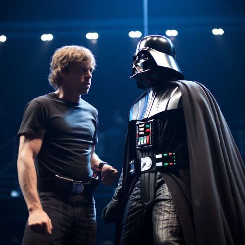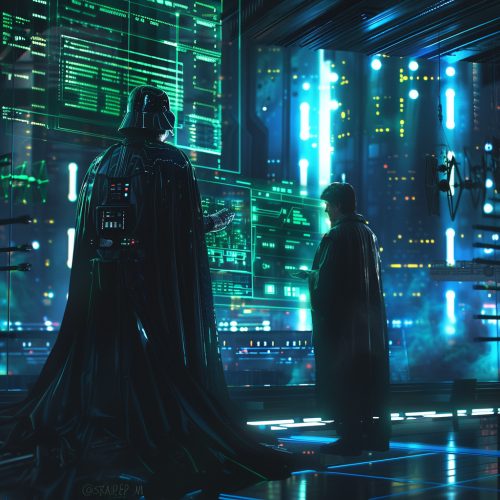 A futuristic scene where Darth Vader and Luke Skywalker explore a high-tech Cellframe data center, surrounded by glowing blue and green LED lights, with holographic displays explaining blockchain technology, Vader intensely focused while Luke is curious, illuminated by cyberpunk lighting, cinematic shadows, inspired by Blade Runner --v 6.0