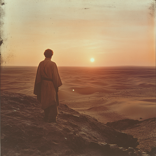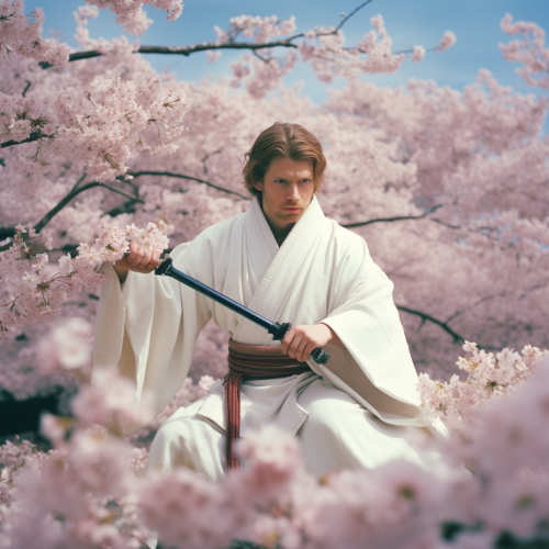 autochrome still of Luke Skywalker in white robes as a Ronin with a blue katana in the style of feudal japan in the 1400's, edgy, 8k, cherry blossom pedals floating in the air, on Agfa Vista, 35mm lens, f/1.8
