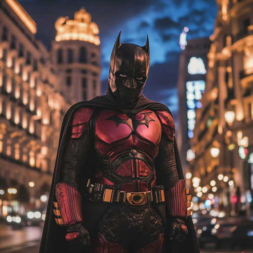 Create a realistic photo of a male superhero who is a mix between Dart Vader and Batman in red costum , in a waist-up frontal shot. In the background , the Gran Vía in Madrid can be seen at night