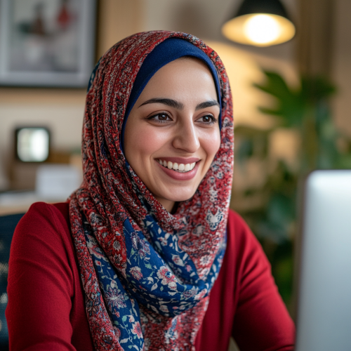 a middle eastern woman (40 year ) smiling at her computer during a virtual meeting, engaging with people on screen. wearing red and blue Keywords: community building, connection, collaboration. Camera: DSLR, Lens: 35mm. Warm, soft lighting for connection. --ar 16:9