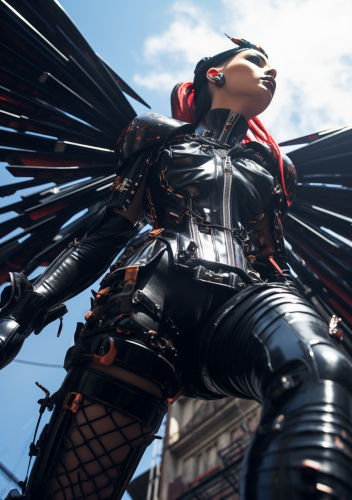 It should be a realistic, modern image, photographed from below, close to the soles, as full-length portrait an angelic punk woman with illuminated subcutaneous biomorphic pores descends from the sky, wearing a black shiny leather skirt and bold outerwear. She has piercings on her chest. She wears boots and latex stockings with a spiked collar and headdress. As well as the one with black shiny robot wings sticking out of his back. Her dress and wings are decorated with gold. The woman is looking down and has a black shiny full mask on her face. The light source illuminates the angel punk from below. The background is dark and simple to emphasize the female figure. Photorealistic, high quality, hyperrealistic, up beta, 32k uhd, --ar 21:30 --s 300 --v 5.2 --style raw
