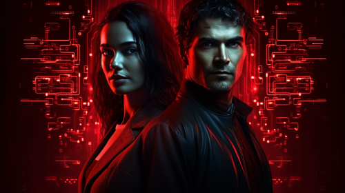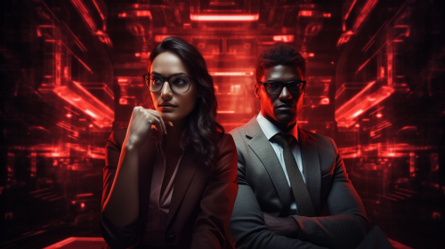 team of diverse people wearing casual clothes with arms crossed, strong stance, in a modern workplace, there's rays of technology in the background, dark red accents, photo-realistic, Nikon D3400 Dslr, --ar 16:9 --v 5.2