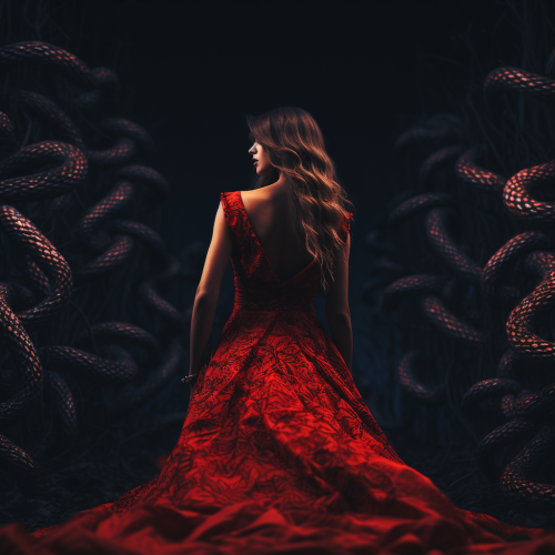 woman with brown hair facing away wearing red dress, pitch black background, ethereal vibe in the garden of eden, snake wrapped around tree, cinematographic shot, 4k resolution, dark and myserious vibe