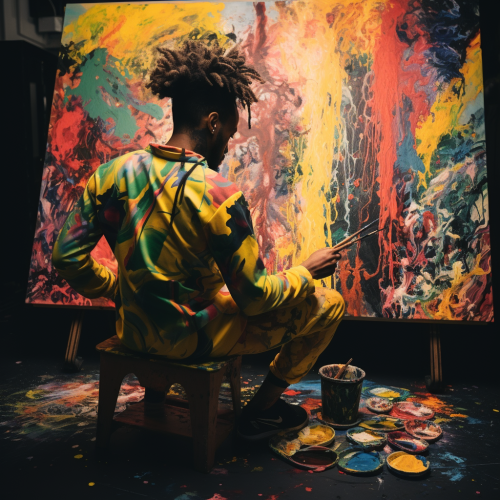 a black non binary individual, who is a painter, they have on a jumpsuit with paint on it, working in a studio