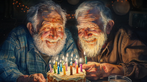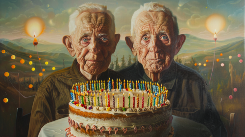 fine art ultra-hyper-realistic masterpiece portrait oil painting by Grant Wood of the two oldest identical twin men in the world celebrating their birthdays with a massive birthday cake with hundreds of candles, rustic scenery backdrop, bright loop lighting, superb bokeh --ar 16:9 --no hands