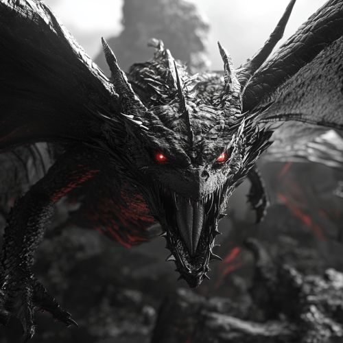 red eyes black dragon in the style of Kentaro Miura, black and white, berserk manga, 3d blender rendering, 4k, awesome background, full body shown, realism, manga